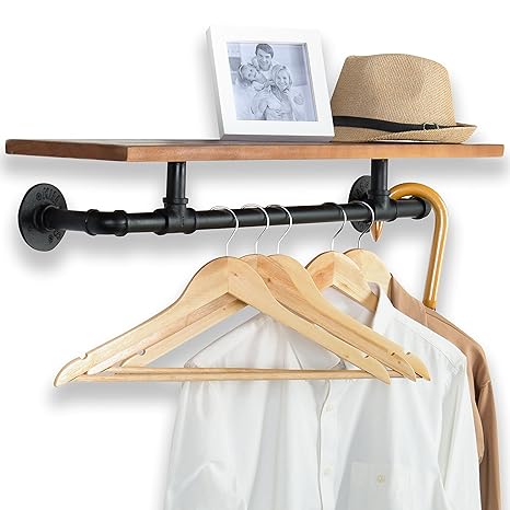 31 Inch Industrial Style Black Metal Pipe Wood Wall Mounted Clothing Rods Storage Shelf Hanging Closet